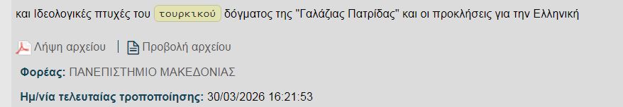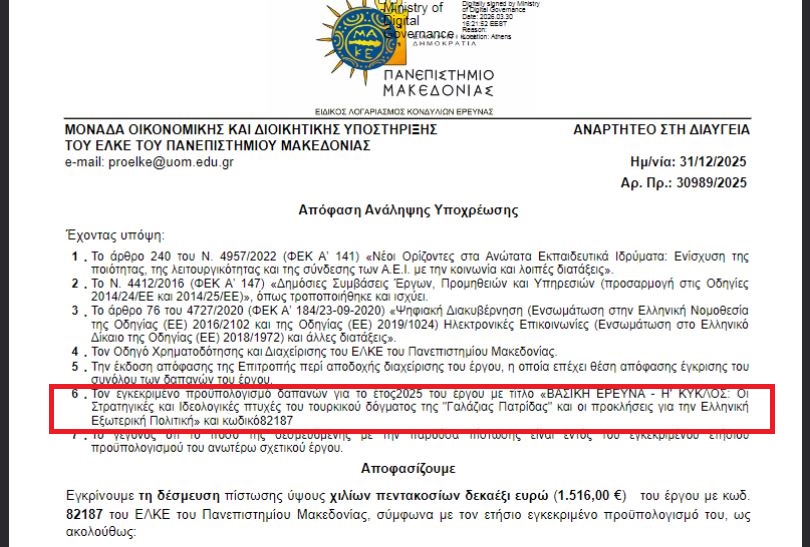Ο λόγος για το Πανεπιστήμιο Μακεδονίας, όπου «τρέχει» πρόγραμμα με αντικείμενο τις στρατηγικές και ιδεολογικές πτυχές του τουρκικού δόγματος και —κυρίως— το πώς αυτό ακουμπά την ελληνική εξωτερική πολιτική.