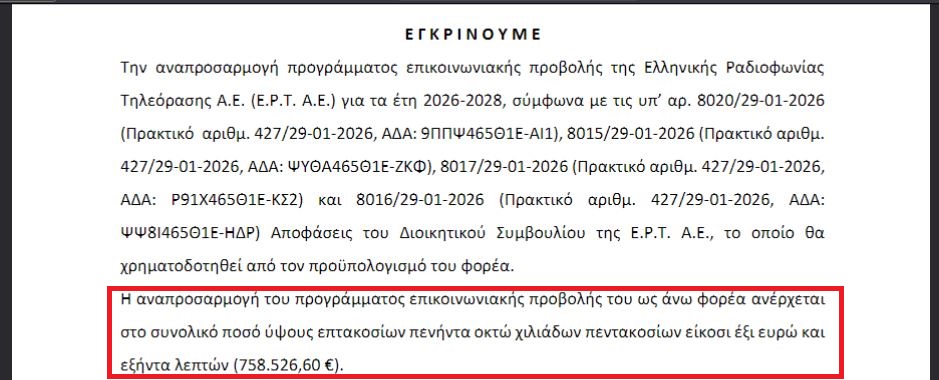 Έπεσαν οι υπογραφές για την αναπροσαρμογή του επικοινωνιακού προγράμματος της ΕΡΤ για την περίοδο 2026-2028. Το νούμερο… ζαλίζει! 758.526,60 ευρώ! Δεν τα λες και λίγα…