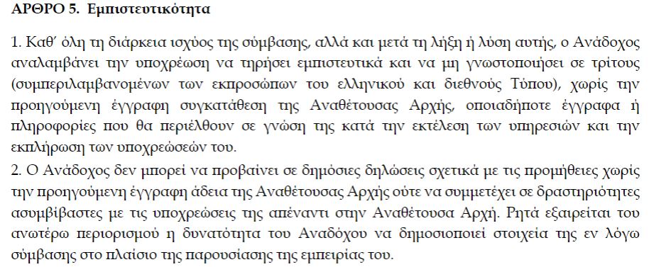 Το spicy info: Η σύμβαση (Άρθρο 5) επιβάλλει στον ανάδοχο από τη Μεταμόρφωση έναν όρκο σιωπής που θα ζήλευαν και οι μυστικές υπηρεσίες. Απαγορεύεται ρητά οποιαδήποτε δήλωση στον Τύπο. Φαίνεται πως ό,τι συμβαίνει κάτω από τη σέλα της Υπουργού, παραμένει “κρατικό μυστικό”.